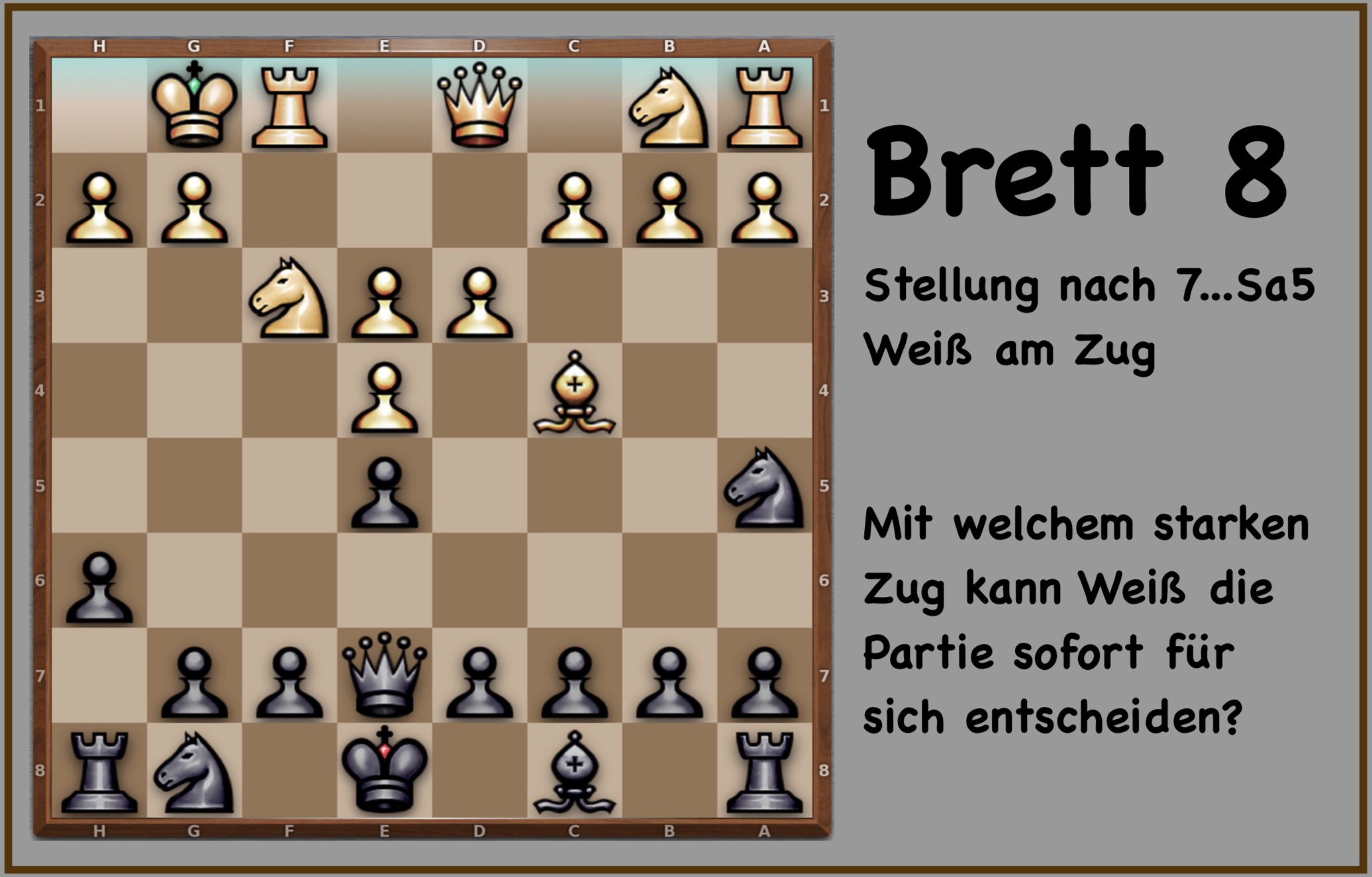 Am 8. Brett wurde eine Italienische Partie gespielt. Bernhard spielte mit Schwarz. Im 8. Zug übersah Weiß nach …Sa5 ein sehr starkes Läuferopfer (8.Lxf7+!), welches nach Annahme durch Schwarz, Sieg für Weiß bedeutet hätte - durch taktische Möglichkeiten mit Abzugsschach und Damenverlust für Schwarz oder zumindest enormem Materialgewinn für Weiß (siehe Bild). Auch nach Ablehnung des Opfers hätte Weiß deutlich besser gestanden, so kam es aber zum Abtausch des Läufers und die Partie verlief erstmal in ruhigem Fahrwasser. Bernhard gab im Mittelspiel die Qualität und die Partie mündete in ein Endspiel mit gleicher Zahl an Bauern und Läufer gegen Turm. Dieses konnte Bernhard erfreulicherweise doch noch Remis halten. 3 : 1.